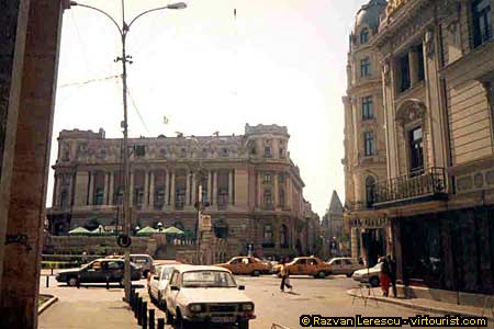 A gigantic flag is placed in the middle of this square called the Square of the Flag. The building right in front of you is the Army Club, a very impressive ornate building dating from 1912 and having as creators the architects Dimitrie Maimarolu, Victor Stefanescu and Ernest Doneaud. The Capsa on the right, established in 1852, is Bucharest's version of Cafe de Flore, the famous cafe in Paris. This was the meeting place for the intellectual elite of the country, nowadays it still retains its looks but the people are mostly nouveaux riches, not necesarily enlightened.