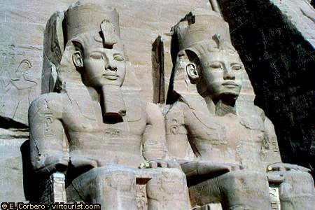 Four colossal statues of the great pharaoh more than 65 feet high (20 meters high) take up almost all the space of the 108 feet high and 125 feet wide facade. Smaller size statues of his wives, sons and daughters appear beside his legs.