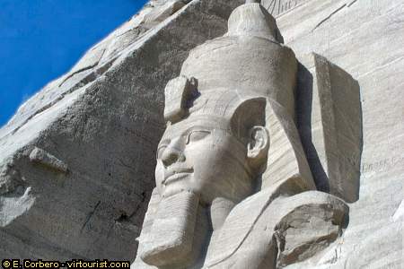 The Colossi of the king, as the rest of the temple, were carved out of solid rock. The statues of Ramses II wear the double crown (symbolizing his rule over of upper and lower Egypt), and the characteristic Nemes head cloth. On his forehead, the royal Uraeus, protects him against all evil.