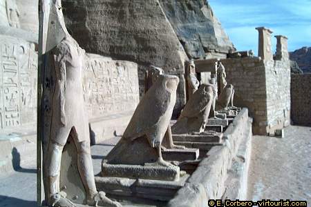 In much smaller size, between the feet of Ramses II appear statues of his sons, daughters and wives. Among others there are statues of Prince Amenhirkhopshef, the Kings mother Muttuya, Princess Bent'anta and, of course, of his favorite wife: Queen Nefertari. Ramses II dedicated to this wife not only a small statue, but a complete temple: the Temple of Nefertari, also called the Temple of Hathor.