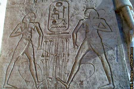 These reliefs depict Nile gods uniting Egypt. Bellow them there are the African and Asian slaves captured in the Empire's battles.