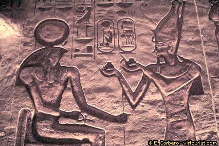 In this other scene you can see Ramses in front of Ra. In other scenes the reliefs depict the coronation of the king by Horus and Seith and presenting Ma'at to Amun. In other rooms there are reliefs of the battles of Ramses II in presence of his most loved wife, the Queen Nefertari.