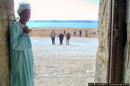 You can see here the huge Lake Nasser from inside the Hathor Temple. In the left you see one of the temple's guardians. They are here to guard the temple and to guide visitors, but most of the time they just stand waiting for a baksheesh (=money). In this temple they did not ask for a tip, but in many other temples I visited in Egypt they did. Usually temples' guides are nice with visitors, showing them places they would have missed. Remember that giving a baksheesh is not an obligation, but it is a good way to spend your spare Egyptian notes (in Egypt coins are extremely rare).