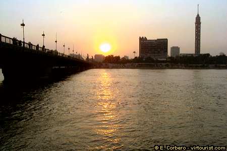 The bridge on the left is the Tahrir bridge, which links Midan Tahrir with Gezhira. In front of us there is the Nile and the Cairo tower.