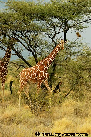 This giraffe, known as a reticulated giraffe because of the geometric shapes on it, can be found in small groups in Samburu. If you look closely, you will small birds, oxpeckers, searching on the giraffe’s body for ticks and other pesky insects.