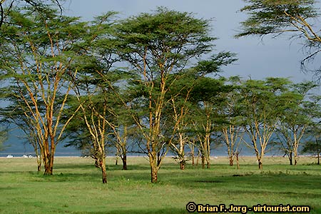 Yellow barked acacias, or fever trees, are found growing in moist areas around the lake.