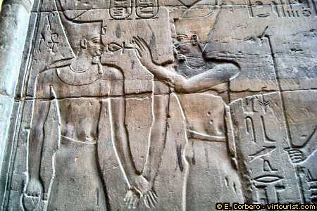 In another room there are the reliefs that relate the birth of Amenophis III. He was supposed to be the son of Amon. This god, disguised as Amenophis's father, met his mother and conceived him.