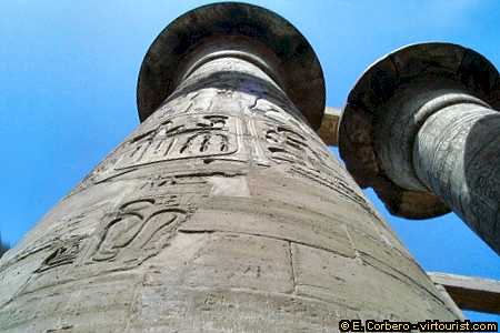 We are now at the heart of the Karnak Temple, the hypostyle hall. This is the most astonishing part of the temple (and one of the most beautiful ruins in Egypt). This part of the temple, that occupies the space between the 3rd and 2nd pylons, was commissioned by Ramses I (129290). Twelve enormous columns, nearly 24 meters (80 feet) high, supported the 5,000 square meters (54,000 square feet) ceiling of the hall. Light entered through holes on the roof and illuminated the huge room. Seven lateral aisles on either side brought the number of pillars to 134. The hall was completed during the reigns of Seti I (129079) and Ramses II (127913).