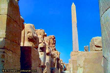 The obelisk you see here is the tallest one in the temple (97 feet - 29.6 m). It was erected by Tuthmosis I daughter, Hatshepsut. She dedicated this obelisk to Amun, as the inscription on the obelisk says. I think Hatshepsut was the first feminist in history. She was the first woman to break the tradition of male kings. During her reign she could do her will, but after her mysterious death, the following pharaohs tried to make her reign fall into oblivion. Her successor, for instance, built a tall wall around the obelisk, only the tip of the obelisk was visible. I wonder why he did not demolish the obelisk instead. Probably because it was dedicated to a god.