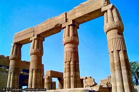 In this photo you can see a colonnade. There are three main types of columns, inspired in three plants: the palm trees (the oldest one), the papyrus (used in courtyards and temples) and the lotus flower (used in domestic architecture). The ones in the photo, if I am not wrong, belong to the second class.