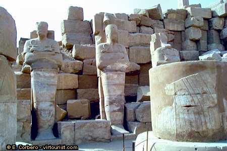 Within the enclosure of the great temple of Amon are included several other small temples and shrines. A temple to Ptah, in the North side of the enclosure, was built by Hatshepsut and Thutmose III and added to by the Ptolemies, who also embellished the great temple of Amon by the addition of granite shrines and gateways. To the south, Ramses III dedicated a temple to Khons, the moon god, which merits attention. A small late temple to Opet, the hippopotamus goddess, adjoins it.