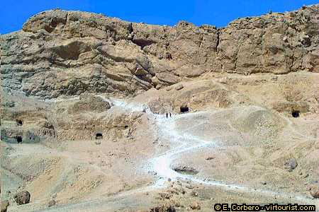 In the mountains surrounding the mortuary temple of queen Hatshepsut, there are tombs of the nobles. You can see some of them in this photo. Not all of them can be visited by tourists, because archeologists are still working here.
