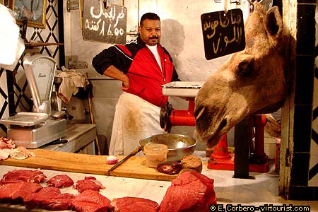 In the picture you can see a meat stall in the covered market of Meknes. I wonder if the meat they sell comes from the animal whose head is hanging on the right. Yes, this is a camel head.