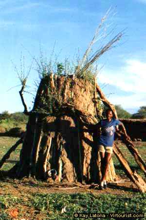 Mamoya, our Mang'anti guide, has allowed me to photograph his grandfather's burial mound, called a bung'et. The bottom part of the mound was built up with wood, which was ultimately smeared with cow's dung. Each month, a higher layer of wood was added until the mound would be completely enclosed at the end of six months. The grandfather had recently died, probably three or four months before this picture was taken. The grandfather's body had been wrapped in the skin of a freshly killed black "male cow," and his head smeared with cow fat. A mound was then prepared in a circle of Trees (stakes?), and the grandfather's body was put inside it in a sitting position, and covered with earth. For thirty days, no work was done by the family, as the extended family came to mourn. After a month, beer was made from honey, and a celebration held. Then the family must move from its houses out of respect to the grandfather. This elaborate ritual is not carried out for every death, for in addition to the killing of the black bull for the burial robe, sufficient cows must be killed and honey procured to provide the visitors with meat and beer for a month.