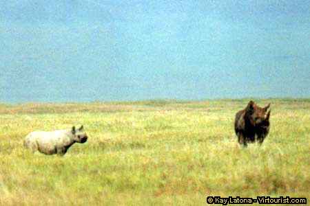 White rhino inhabit the Ngorongoro Crater, also call a caldera. There are two types of rhinoceros: black (pointed lip) and white (square upper lip and more endangered). These were hard to get close to. My rhino photographs in the Crater were taken with a 500 mm lens.