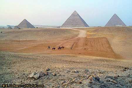 Here we are again! You can see the three big pyramids in Gizah, from left to right: Mikerinos, Kephren and Kheops. On the left of Mikerinos you can see the three small queens pyramids.