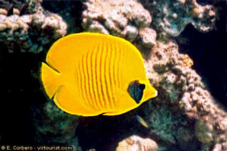 The fish in this photo is a Masked Butterflyfish (chaetodon semilarvatus), endemic to the Red Sea. Butterflyfishes (chaetodontidae) are Among the most colorful and beautiful reef fishes. These fishes use their colorful designs to protect themselves from predators. The masked butterflyfish feeds on coral polyps and sponges and it is up to 23 cm long.