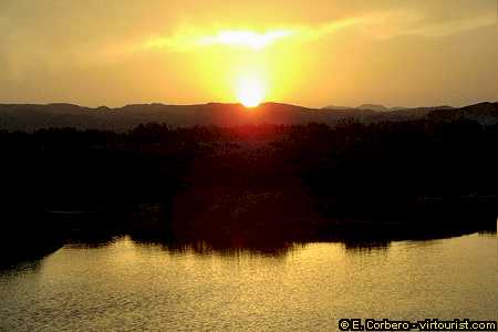 In this photo we can see a wonderful sun set. The four scuba diving resorts in Marsa Alam are located in the middle of nowhere. In front of us there are more than 200 miles of desert, on our left (south) there are more than 20 miles to the town of Marsa Alam and to the right (North) there are almost 100 miles to the closest village. At our back we have the unspoiled waters of the Red Sea.