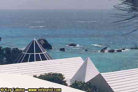 That ocean is never far away from you! While on the island, you can grab a cab or take a carriage tour, but forget about renting a car. It really makes sense to sample the wide variety of local transportation, including rental motor scooters! (I have to tell you, though, if you've never ridden before, and can't learn in 15 minutes in a tiny parking lot, forget it!) Yes, this is partly a tour of roofs because I've never seen such beautifully shaped roofs outside of Bermuda! (Well, O.K., Turkey and Russia.) Let's step back from this house and drive down the road a little ....