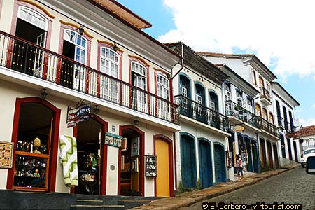 Ouro Preto is very famous for its colonial architecture. Especially famous are its houses, with a white facade and a red roof. Most of the doors and windows are painted in vivid colors (green, blue, yellow, ...), as you can see in this picture.