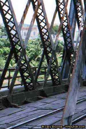 Now the bridge is used by cars. The wood boards come up as you drive across (clunk-iti-clunk), so it's most alarming! Somebody fell through while he was walking across and he drowned! On the bridge, it's a fight between pedestrians and drivers. You can see the old rail lines that they never removed. The thick wooden boards run parallel to the track.