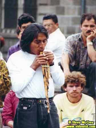 ah, it IS Peruvian music. This guy is part of a group that is traveling around North America. Lets buy a cassette from him. His music is calming and delightful, so we can forget the fumes of the cars around us. Say, would you like to see a funny way to deal with the growth of the automobile in Costa Rica? Follow me [Next »]