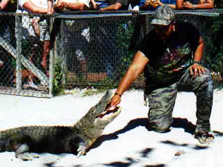 The show is quite amazing. The man hits the top of the nose of the alligator. Then the man touches the tongue of the alligator with his hand ; and quickly pulls it away! A tap on the tongue and then the jaws snap! Fortunately, the alligator misses the guy's hand! Can you count his fingers? I think he has five on his left hand.