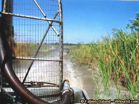 This is a rear view from the airboat. A typical airboat is built to operate over shallow water. There is no rudder in the water, just a flat-bottomed boat. The bottom of the boat is about 30 centimeters under the surface of the water. A large fan pulls the air in front of the boat and pushes the air back past the rudder. In this photo, you can see the exhaust pipe of the engine. Keep your hands inside the boat! You can see the long blades of grass ; like a blade of a sword, the edge of the grass can cut you.