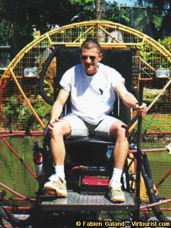 The people at the airboat tour are nice; they let you sit in the driver's seat. The gas pedal is under your right foot, the long bar in your left hand steers the boat. If you move the bar forward, the rudder rotates and the rear of the boat is pushed by the air. It is a strange sensation to feel the boat turn from the back. Because it is a light boat, it changes direction very easily. Other important parts of the machine include the battery between the legs of my friend (who is a UN peace-keeping soldier on vacation!). You can also see the large radiator behind my friend, with the black pipe that takes hot water up to the radiator. The most important safety equipment is the fire extinguisher next to my friend's right knee! Well, that's the tour! Good bye!