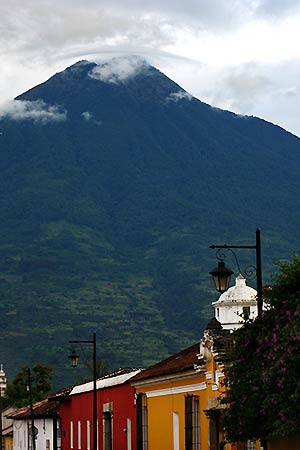 Here you can see the imposing Volcano Agua as seen from the center of Antigua. Spaniards called the volcano Agua (Water) after seeing a mudslide, originated by a volcano eruption, destroy the first capital of Guatemala back in 1541. The volcano is currently not active, but scientists say some day it may be.
