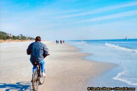 Although I took this particular photo in January, the beach looks just as uncrowded in the summer months. How can that be, you might be asking. You see, the beach is so long that even where it is crowded, such as near hotels and public entries, just a few hundred yards or so away it can be practically deserted. A very popular public beach is by Coligny Plaza where there are lots of shops and restaurants. In January the temperatures are generally in the fifties and sixties Fahrenheit; not hot enough for swimming, but perfect for biking, golfing, playing tennis, etc. In the summer months, the weather is hot and humid and people jump into the ocean or swimming pools. Another place that is great to bike, apart from the miles of bike trails, is on the golf course. In the plantation of Palmetto Dunes, for example, you can bike on the golf courses before 7 a.m. and after 7 p.m. Smashing.