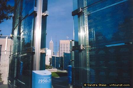 Another way to explore the White River State Park is to walk. It's a humdingery doo walk! Walking enables you to see things you normally wouldn't. This is the nation's only memorial honoring all recipients of the Medal of Honor, the United States' highest award for military valor. There you'll find 27 walls of curved glass, representing every conflict since the Civil War when Congress established the Medal of Honor.