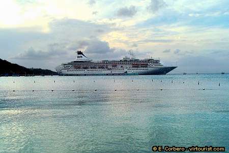 In this picture you can see one of the huge cruisers that periodically visit the bay of Ocho Rios. When one of these cruise ships visits the town, everything changes. As soon as the ships arrive, the streets of uptown Ocho Rios get crowded with tourists with colorful T-shirts, bermuda shorts, and a wallet full of American dollars. Many of them will only leave the ship to buy a souvenir; others will be luckier, and will go to the Dunn's River Falls; but some of them will choose to stay on the ship; they will miss some of the views of their life!