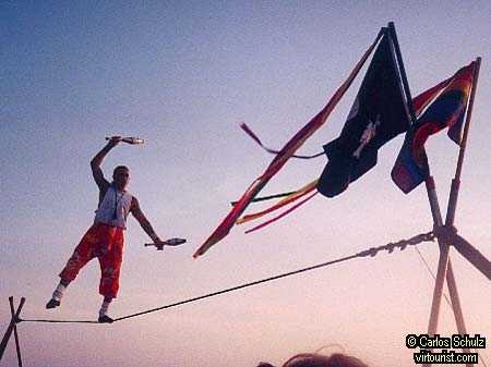 Or we can wander over and watch the tightrope walker, the magician, the dogs that do tricks, the guy who balances a stove or a dishwasher on his chin, and a dozen other performers and vendors (buy a coconut and mail it, try a fruit shake, get a backrub).