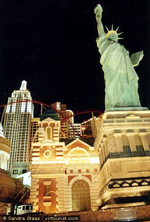 Las Vegas is like a huge theme park made especially for adults. The New York Hotel-Casino has 12 interconnecting hotel towers which recreate the New York skyline. There's also a roller coaster here, if you'd like to experience the ups and downs of life. Close by is the Luxor which cost some 375 million dollars to build. From the top of its pyramid shines the most powerful beam of light in the world. And after you're trotted throughout the New York and the Luxor then take the monorail which links to the Excalibur, another Hotel-Casino. If you can steal yourself away from the casinos, visit the Convention Center too.