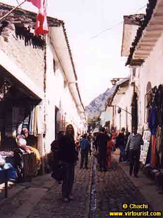 The street you see is in Pisac, one of many towns that were established along the river at the base of the tall spine of the Cordillera mountains. The stone street and the thick walls of the homes are ready for the next earthquake. When it rains, it pours, so the street is designed to pull away the water.