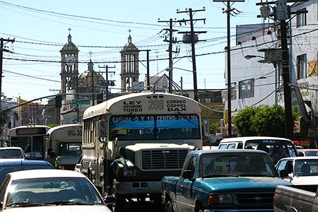 In the picture you can see a Tijuana public bus, with the Cathedral of Tijuana in the background.