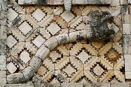 The decoration of the upper walls of the buildings is pretty rich, following the Puuc style. On the walls you can see a relief depicting one of the Maya's main gods, Quetzalcoat or the feather snake.