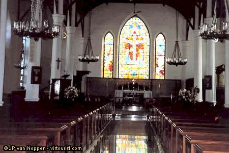 Nassau has the highest concentration of churches I have ever seen. The population is very religious, and religion seems to pervade much of their life and language. The local radio and television broadcasts religious programmes round the clock, and every denomination or sub- or sub-sub-denomination seems to be represented and active. Methodism is particularly well represented, and has been around for centuries. On the outskirts of town, where Nassau keeps expanding, the first building to go up on a block is the church. This picture shows the inside of the Anglican cathedral.