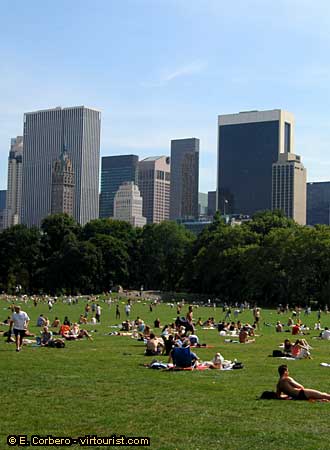 Central Park is the lung of the city. It stretches from 59th to 110th streets between 5th and 8th Avenues. On sunny weekends, the park welcomes the stressed-out New Yorkers. They come here to skate, to jog, to play baseball, or just to stroll. In summer, many locals, and tourists as well, come here to attend theater plays or improvised live concerts.