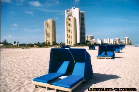 Lovely beach. But where are all the people? A cool day in January keeps sunbathers away. Yet the blue chairs are still out awaiting the arrival of happy people ready to bask in the sun. Condominiums and hotels line the beach as far as the eye can see.