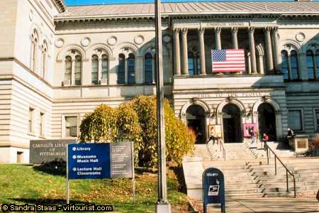 Built in 1895, the Carnegie Library proudly proclaims "Free to the People" above the doorways. The magnanimous Andrew Carnegie bequeathed libraries, a university and museums to the people of Pittsburgh; perhaps to ensure his stairway to heaven. After taking so much from the people who worked in his mills, this Scottish laird of Pittsburgh opened his gentle palm and let trickle forth some of his pennies onto their empty bellies. Andrew Carnegie was the exemplary immigrant; rising from rags to riches, fulfilling the American Dream. He makes us, the Scottish immigrants of later years, look somewhat inadequate. Pity the Carnegie Museums and Carnegie- Mellon University are not also free to the people.