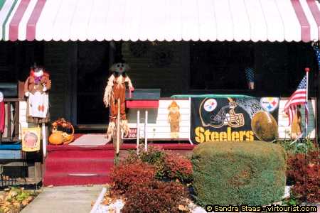 Homestead is a neighbourhood where life centred around the steel mills. This very typical row house found in Pittsburgh neighbourhoods is all decked out for Halloween, Thanksgiving and the Steelers football team.