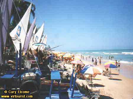 This is the part of Recife's beach that is not protected by the reef. Notice the boats on the left. The original "jangada" was a fishing raft, which has been developed as a sit-down windsurfer. It rolls into the water. The umbrellas are for rent and it's a delightful area. Boa Viagem means "good trip" and a visit to this beach will bring you good memories.