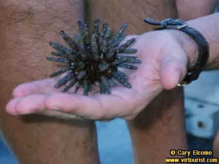 Urchins appear in several sizes. This green one with fatter arms appears more acceptable. Our boatman simply dived off the raft, with no equipment, disappeared for a few minutes, then came back with this "prize." Well, that's our tour! I hope you will come to experience the delights of Recife and Boa Viagem someday!