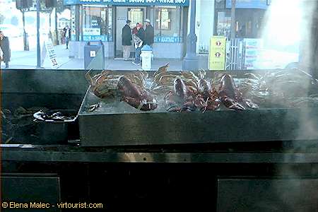 The opening of the crab season in November is a festive occasion. The Fisherman's Wharf celebrates it, traditionally, with a religious procession and the priestly blessing of the fleet. Here is Dungeness crab on ice displayed on the covered sidewalk short before disappearing in the steaming cauldrons which tantalize the visitors. The crab season lasts until June but fresh seafood and fish can be enjoyed here year-round.