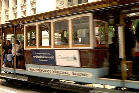 Here is a cable car. A cable car works like a detachable ski lift chair. Except the cable that pulls it up hills is hidden beneath a middle track under the cable car. When the cable car makes a stop, it detaches from the cable. The reason cable cars were used in San Francisco (and there were many more lines than exist today) was because the hills were too steep to use horse-drawn street cars or even electric street cars. Another interesting fact about San Francisco's cable cars: They are the only moving national monument in the US.