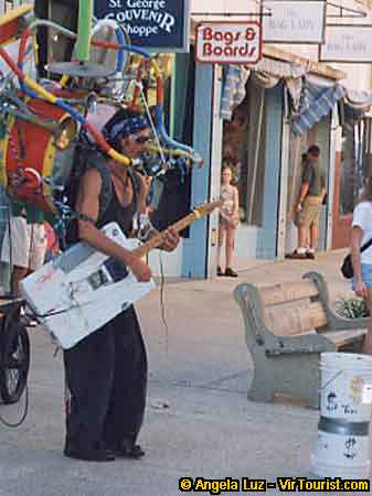 Do you hear the music? This guy is a one-man band. He is going to stomp and thump his way through Beatle songs. Well, let's walk past more little shops in the downtown area.