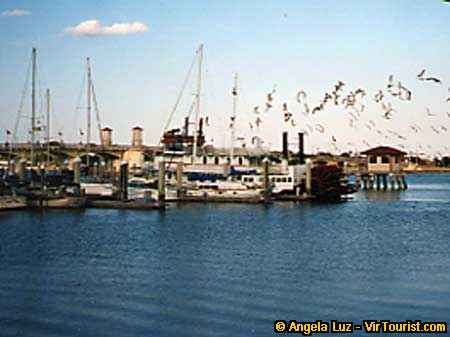 Now we are driving toward the beach. Behind the birds, you can see St. Augustine Beach, which has shops and restaurants and hotels inns, and a marina. We can find very fresh fish here at reasonable prices. Yes, the prices are cheaper than the prices in Fort Lauderdale!
