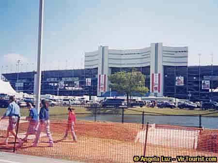 Here is a view of the famous race track with a lake in front. The orange net protected the pedestrians from the road. There was a lot of construction taking place when I visited, so maybe things will look better when you visit Daytona!